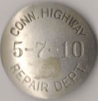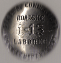 CONNECTICUT HIGHWAY REPAIR DEPT. AND ROADSIDE LABORER BADGES. I AM NOT SURE WHAT THE NUMBERS MEAN. THEY MAY BE THE DATE OF ISSUE?