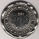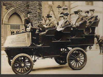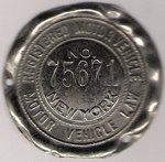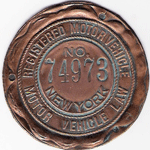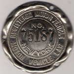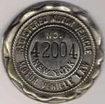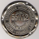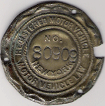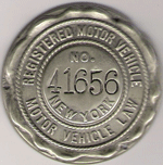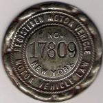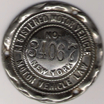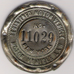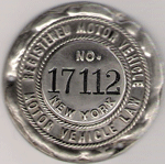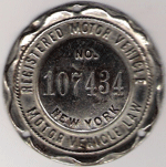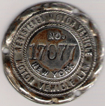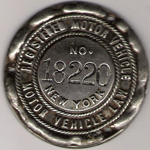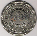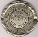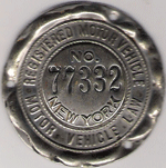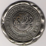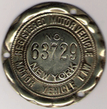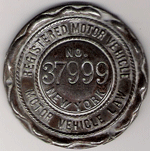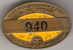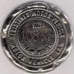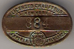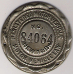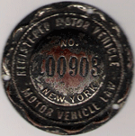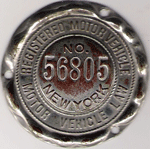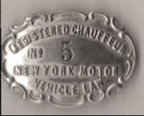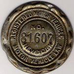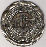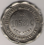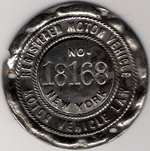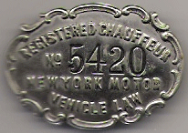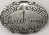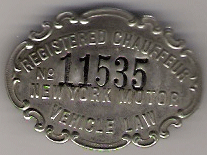 NEW YORK STATE REQUIRED THE USE OF CHAUFFEUR BADGES FROM 1904-1928. I HAVE A 1929 PROTOTYPE. THE FIRST THREE WERE UNDATED. THANKS TO SUSAN CONNOLLY FOR HER HELP IN GETTING THE #1 BADGE. IT BELONGED TO HER GREAT, GREAT UNCLE DICK ROBE.THE FIRST UNDATED BADGE ("A" BADGE) WAS USED FROM 1904-1909. THE BREAKDOWN IS AS FOLLOWS 1904 (1-2266), 1905 (2267-6653), 1906 (6654-13,631), 1907 (13,632-23,020), 1908 (23021-33356), 1909 (33357-48884), 7 31,1910 (48885-58480). THE LARGE ROUND ("B" BADGE) WAS USED IN 1910. IT WAS ONLY USED FOR A SHORT TIME AND IS THE TOUGHEST BADGE TO FIND. THE PHOTOGRAPH IS A 1905 SOUVENIR OF A SIGHT SEEING RIDE ON THE "OBSERVATION AUTOMOBILE".