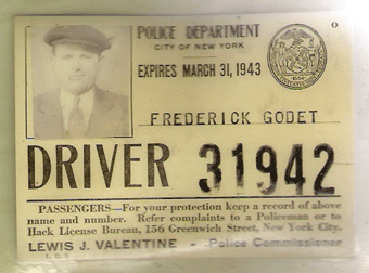 1917 CHAUFFEUR LICENSE AND BADGE. THE NUMBERS (651) MATCH ON BOTH. CARL FREDRIKSON IN HIS CAR. | 1917/18 PUBLIC HACK DRIVER BADGE AND HACK LICENSE. THERE ARE TWO SETS OF NUMBERS ON THIS LICENSE. THE NUMBERS ON THE BADGE (1628) MATCH THE NUMBERS ON THE 1917/18 HACK LICENSE. THE OTHER NUMBERS (651) MATCH THE NUMBERS ON THE 1917 CHAUFFEUR LICENSE AND BADGE. |