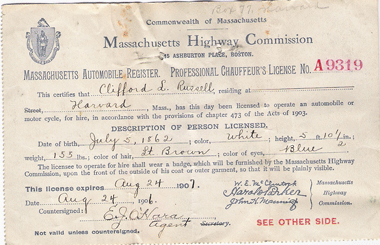 ![]() 1906 MASS PROFESSIONAL CHAUFFEUR LICENSE | ![]() 1906 MASS PROFESSIONAL CHAUFFEUR LICENSE |