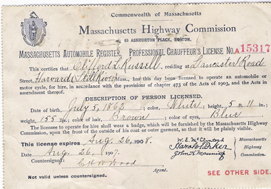 ![]() 1907 MASS PROFESSIONAL CHAUFFEUR LICENSE | ![]() 1907 MASS PROFESSIONAL CHAUFFEUR LICENSE |