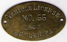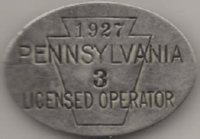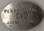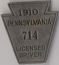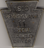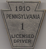 PENNSYLVANIA DRIVER BADGES WERE USED FROM 1910-1919. THE 1910 #1 IS THE FIRST BADGE GIVEN OUT BY THE STATE. I DON'T KNOW WHO IT WAS ISSUED TO. I HAVE A SET WITH THE MATCHING CHAUFFEUR LICENSES. THE PHOTO IS OF A 1903 PHILADELPHIA DRIVER'S LICENSE.