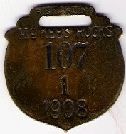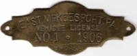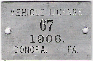 1906 DONORA, PENNSYLVANIA VEHICLE LICENSE | 1912 DONORA, PENNSYLVANIA VEHICLE LICENSE | ![]() 1906 EAST McKEESPORT, PA. 2 HORSE VEHICLE LICENSE | |