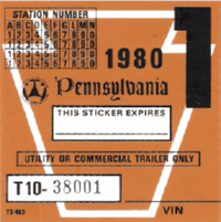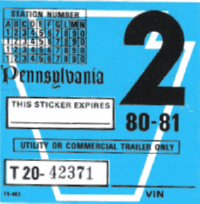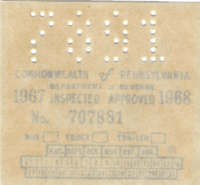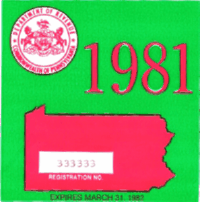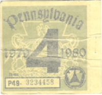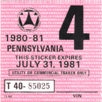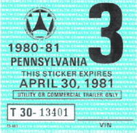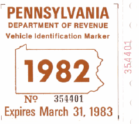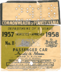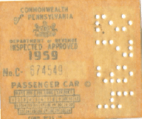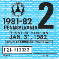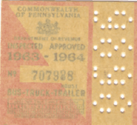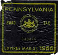 ![]() 1912 SPRING GARDEN BORO. PENNSYLVANIA 1 H VEHICLE LICENSE | ![]() 1958 U. S. ARMY ENGINEER DISTRICT. PITTSBURGH PERMIT NO. 1757 CORPS OF ENGINEERS | ![]() WICKBORO, PENNSYLVANIA 1905 VEHICLE | |