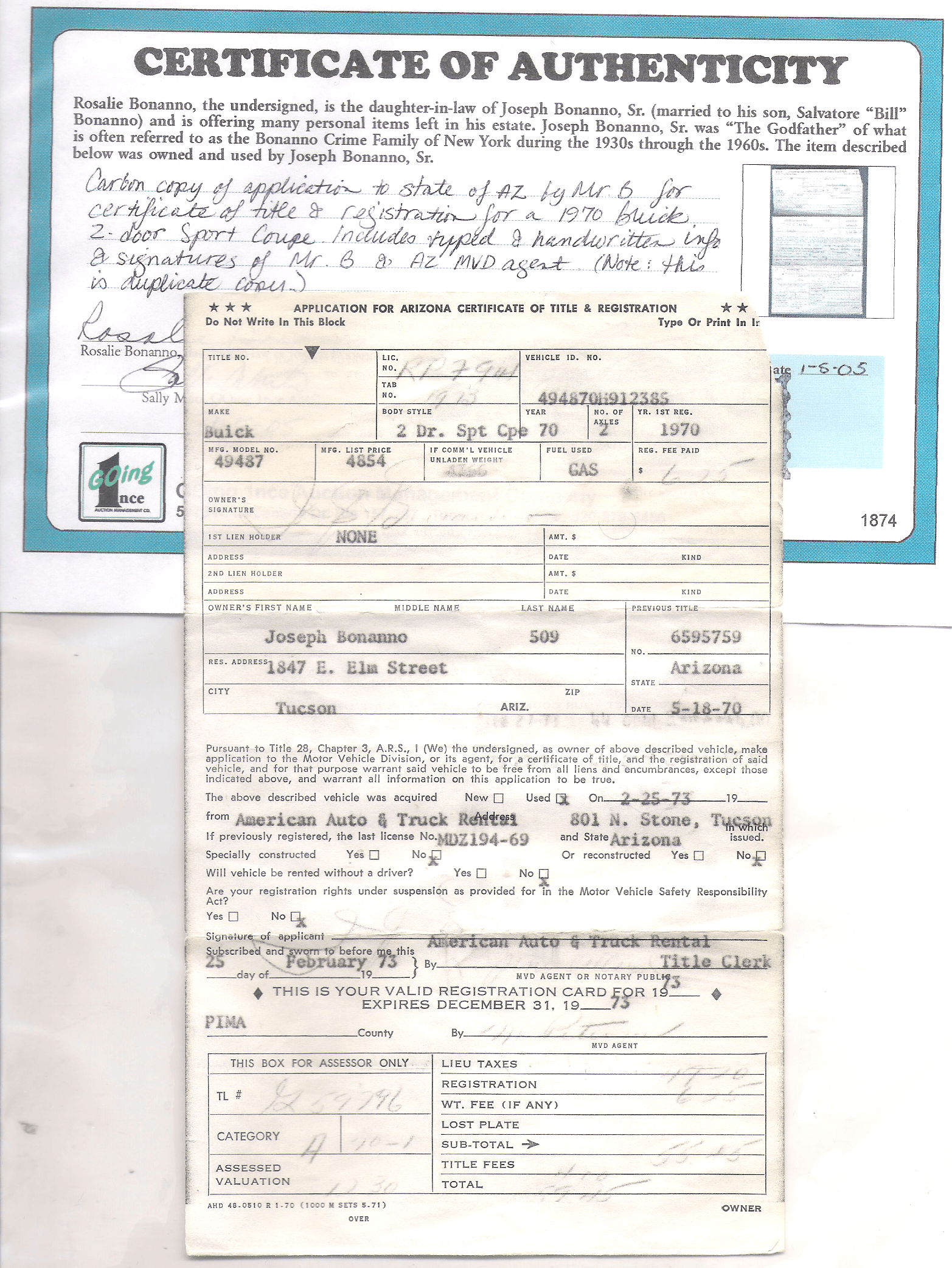 | JOSEPH BONANNO SR 1970 ARIZONA BUICK REGISTRATION |