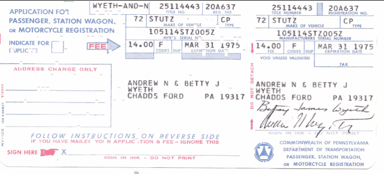 ![]() ANDREW WYETH 1975 REGISTRATION FOR A STUTZ | |