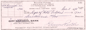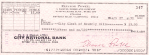 ![]() ![]() | ELEANOR POWELL 1972 CHECK TO CITY CLERK OF BEVERLY HILLS FOR NIGHT PARKING PERMIT 1973 CHECK TO DEPARTMENT OF MOTOR VEHICLES |