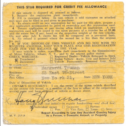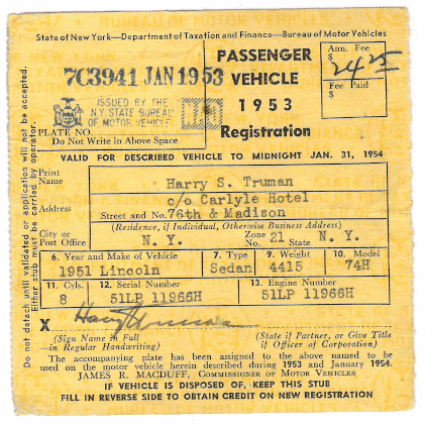 ![]() HARRY S. TRUMAN THE 33RD PRESIDENT. 1953 NEW YORK REGISTRATION FOR A 1951 LINCOLN. | ![]() PRESIDENT TRUMAN PURCHASED THE CAR FOR HIS DAUGHTER MARGARET |