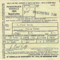 ![]() ![]() | J. PAUL GETTY PLAZA HOTEL 1934 DE SOTO REGISTRATION |