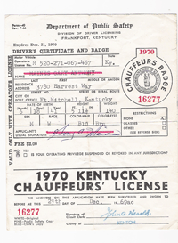 1970 KENTUCKY CHAUFFEUR'S LICENSE HAS A PICTURE OF THE BADGE ON THE LICENSE |