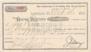 ![]() 1904/05 CITY OF LOUISVILLE, KENTUCKY LICENSED BUGGY | LOUISVILLE, KENTUCKY LICENSED JITNEY | ![]() 1904/05 LOUISVILLE, KENTUCKY LICENSED PEDDLER. SINKING FUND |