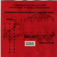 1987/88 KENTUCKY INCREMENTAL EXTENDED WEIGHT COAL HAUL DECAL | 1987/88 KENTUCKY EXTENDED WEIGHT COAL HAUL DECAL |