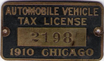 ![]() 1909 ONE HORSE VEHICLE TAX | ![]() 1910 AUTOMOBILE VEHICLE TAX LICENSE | |